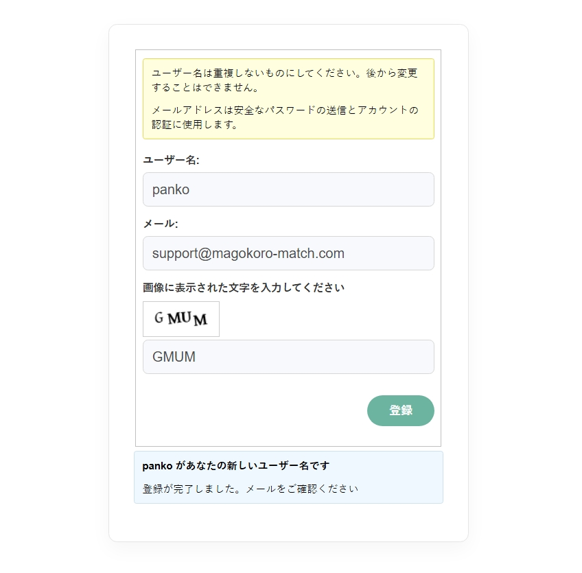 新規登録ページを開き、「ユーザー名」と「メールアドレス」を入力して、登録ボタンを押してください。